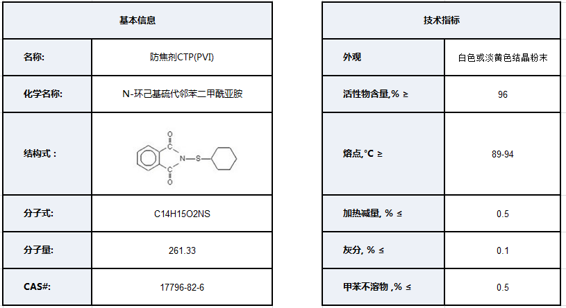 用     途: 本品为公认的优秀防焦剂,用于天然橡胶和合成橡胶,能有效地防止胶料在加工过程中发生早期硫化(焦烧)。并可提高胶料的贮藏稳定性,防止存放时发生自然硫化。本品对于已经经受高热或具有焦烧危险的胶料具有再生作用。