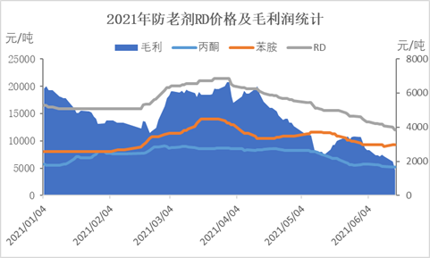 防老剂RD价格下跌受多重因素影响,一是受原料苯胺、丙酮等原料价格下滑利空影响,截止到6月16日,苯胺的价格累积跌幅约为30%,丙酮的价格累积跌幅约为42%;二是受需求偏淡影响,尤其轮胎生产企业开工受限,加之防老剂RD价格下滑利空,导致轮胎对防老剂RD的整体需求偏低。